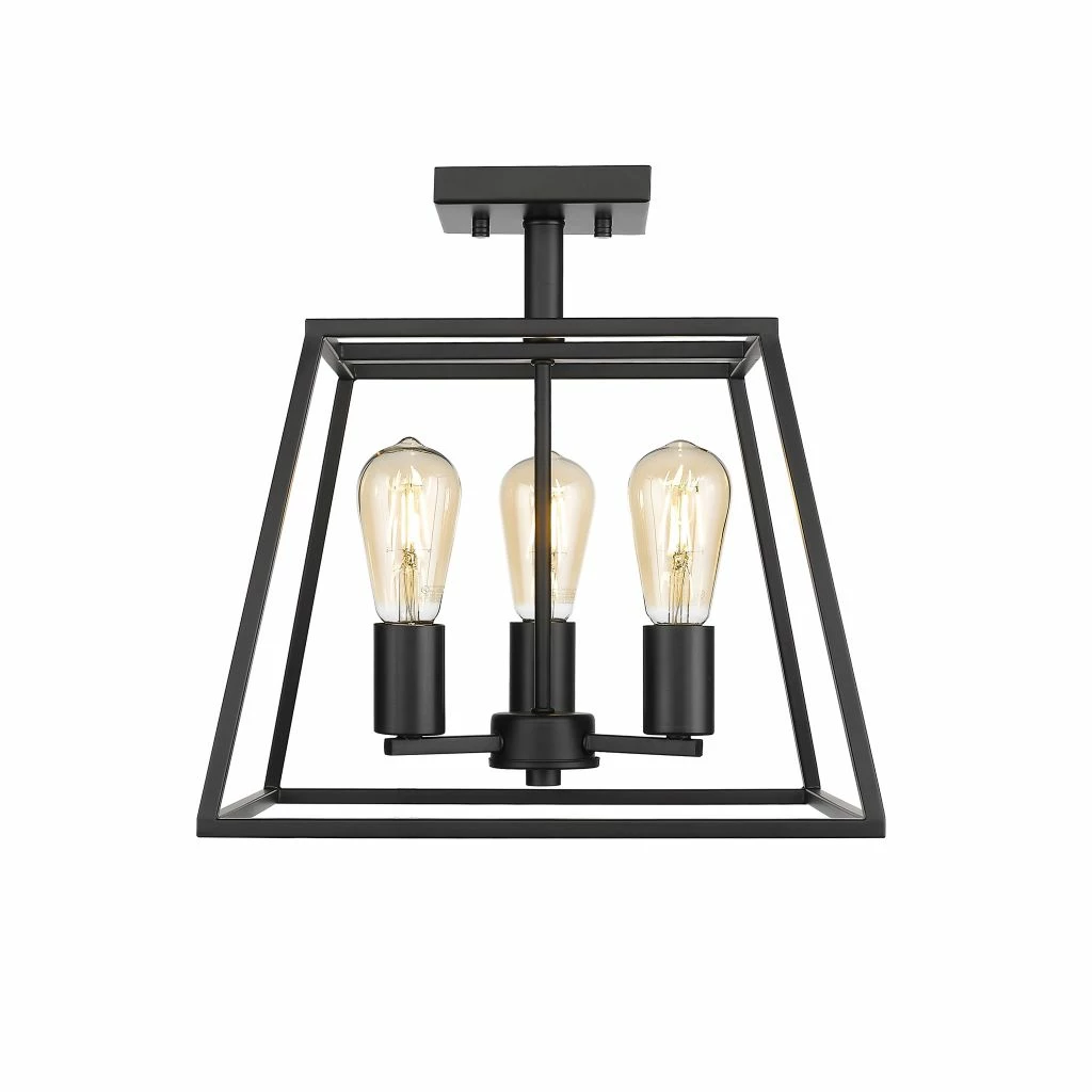 - 13.78-in wide semi-flush mount ceiling fixture with straight edges and a black iron finish is perfect for an industrial or farmhouse designed room