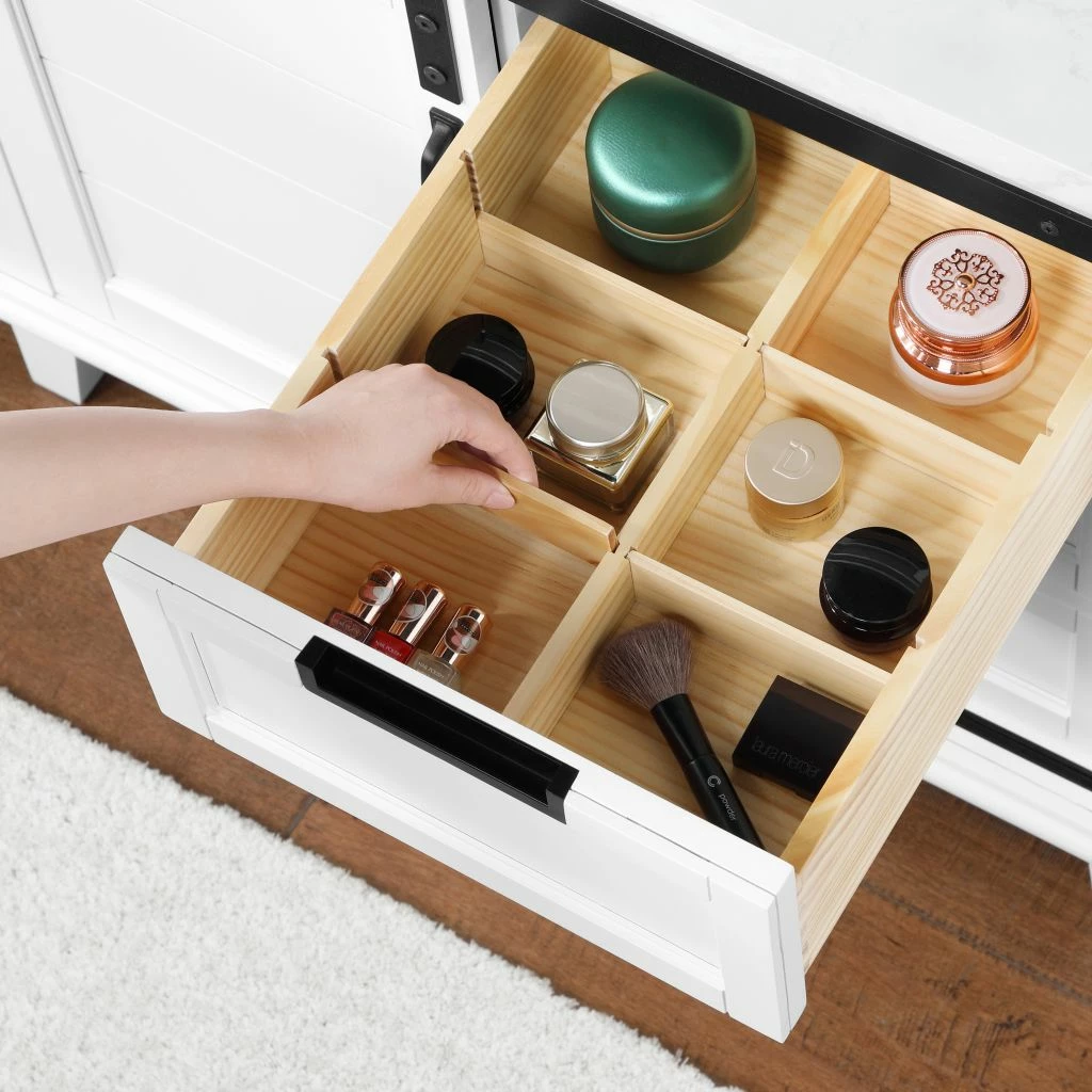 - 3 dovetailed drawers with built-in separator organizers for holding items