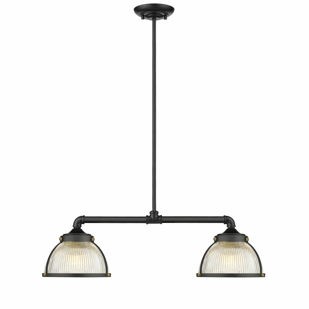 - Light shades are made of transparent annealed glass with vertical stripes and joined by an industrial-inspired black iron rod