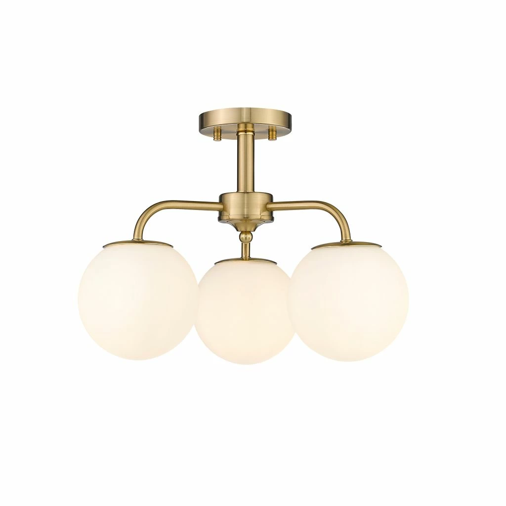 - 14.96-in wide, 3-armed semi-flush mount ceiling fixture in plated brushed gold iron with 3 frosted globe annealed glass shades