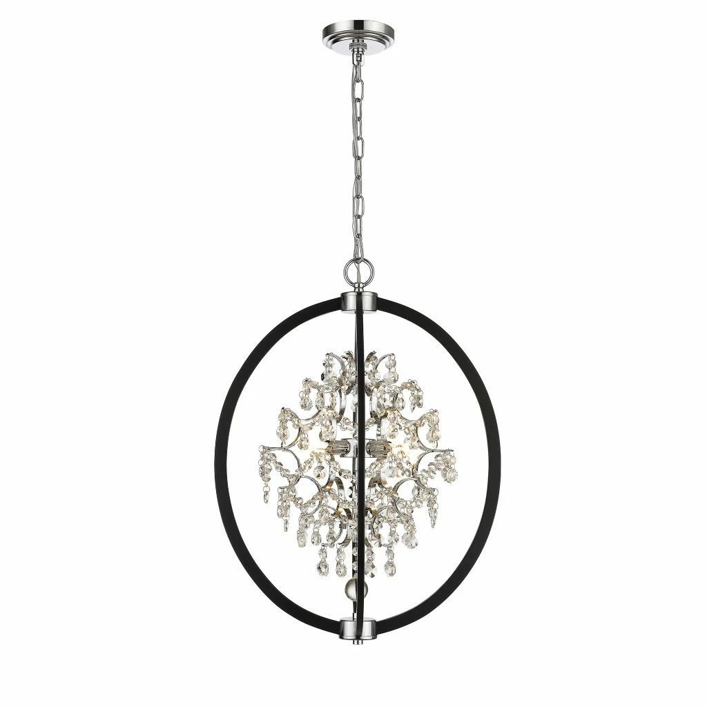 - Black oval cage chandelier with clear crystals, a chrome mounting plate and adjustable chain