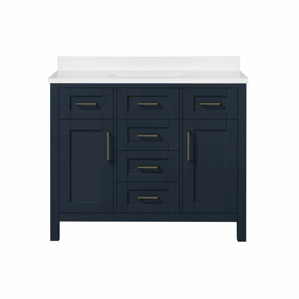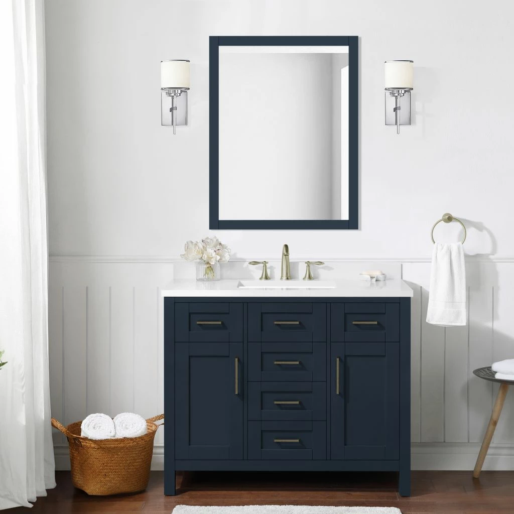 - Midnight blue solid wood frame bathroom vanity with engineered quartz countertop