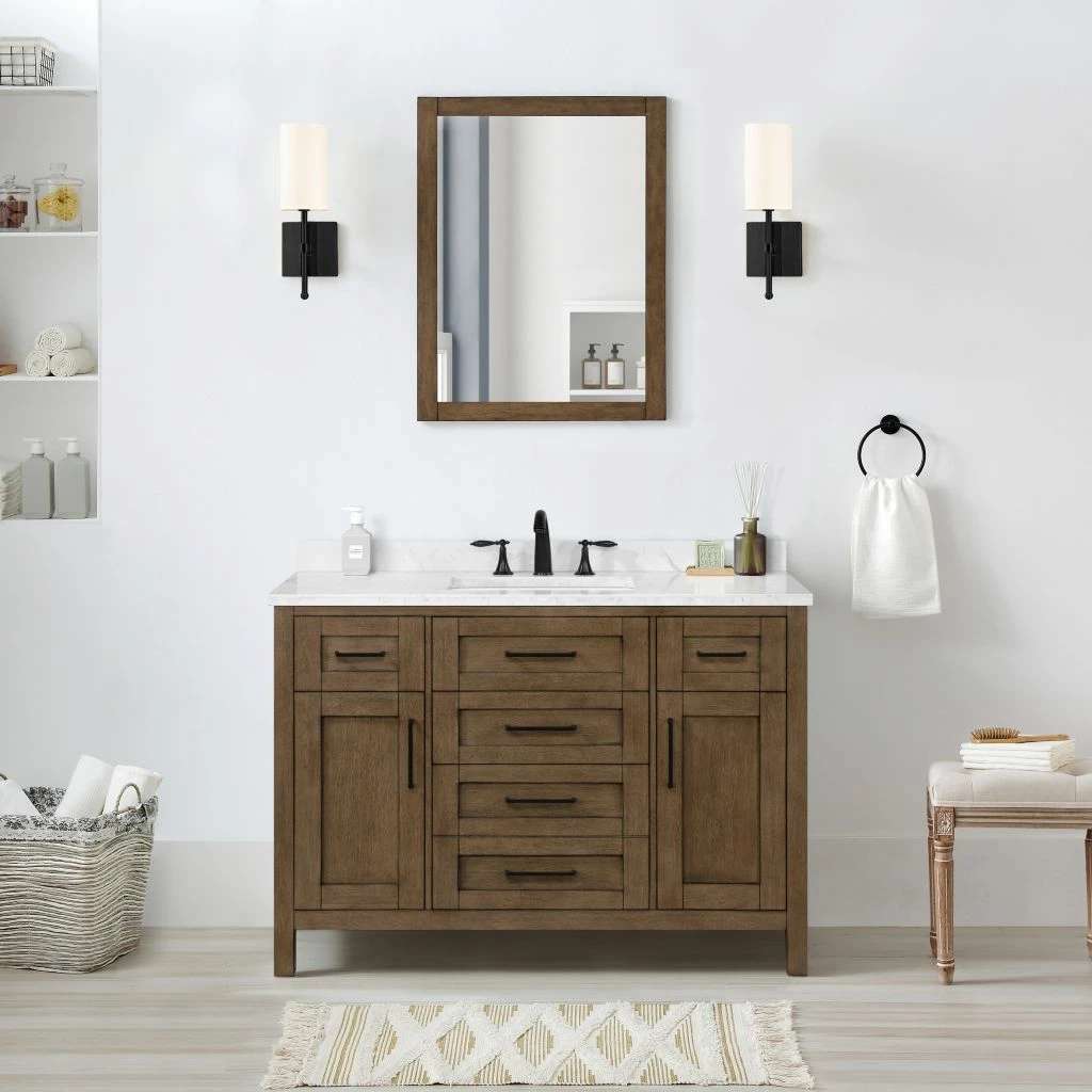 - Dimensions of the single sink bathroom vanity: 48.03 in. W x 21.02 in. D x 34.8 in. H