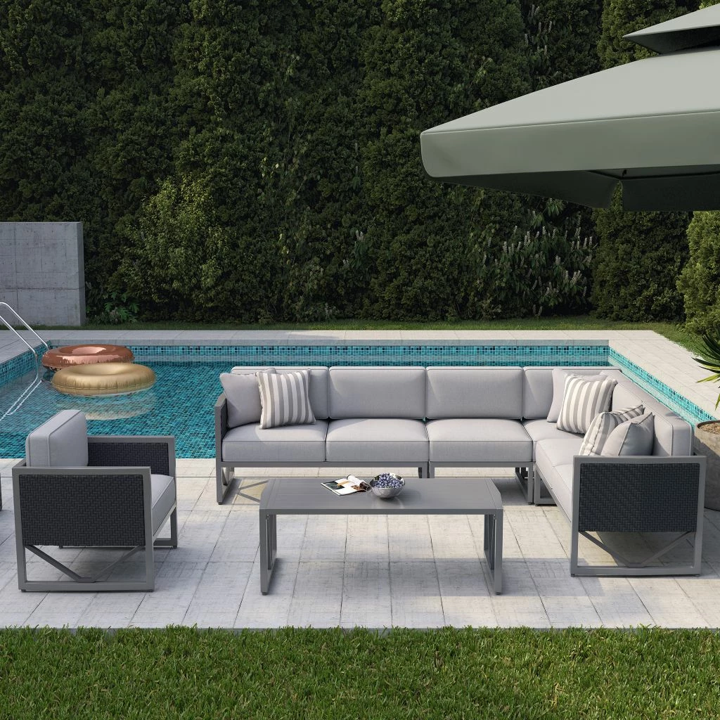 - Sectional patio set Includes: 1 coffee table, 1 club chair, a right and left armrest love seat, a corner seat, and an armless seat with plush cushions and throw pillows, and enough seating for up to 7 people